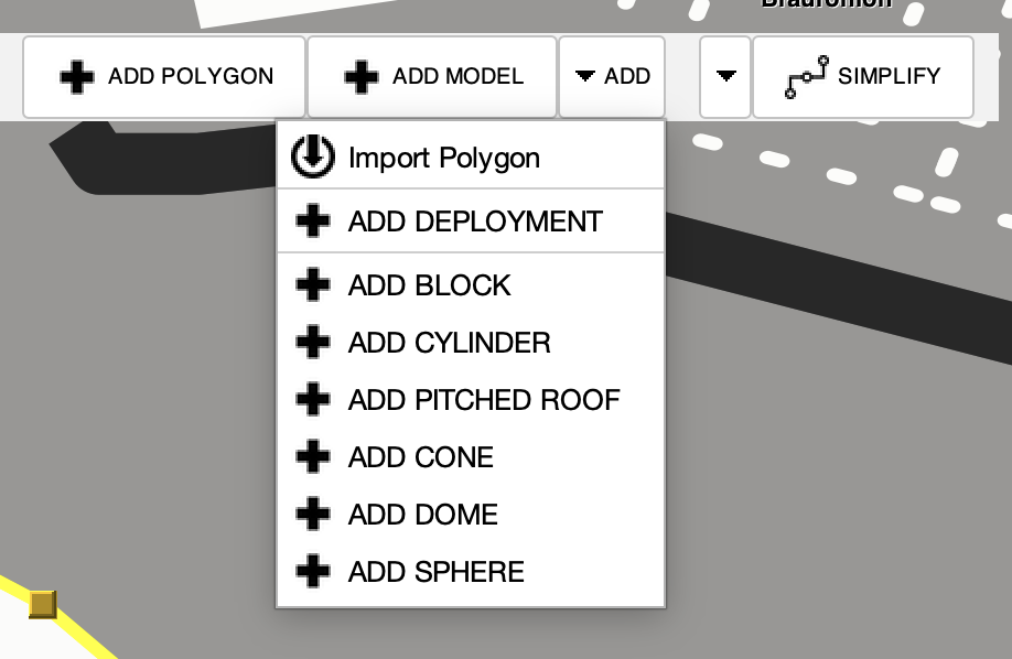 The basic structure data for a building is a 2D footprint. These can be comprised of multiple elements such as blocks, cylinders, polygons, etc. For the simplest buildings, consider using a simple block. If you have more detail on the footprint, then use a polygon to capture the details. Add new elements from the toolbar menu. You may also import a polygon from a data source, including OpenStreetMap, using the same AI Machine Learning model mentioned above.