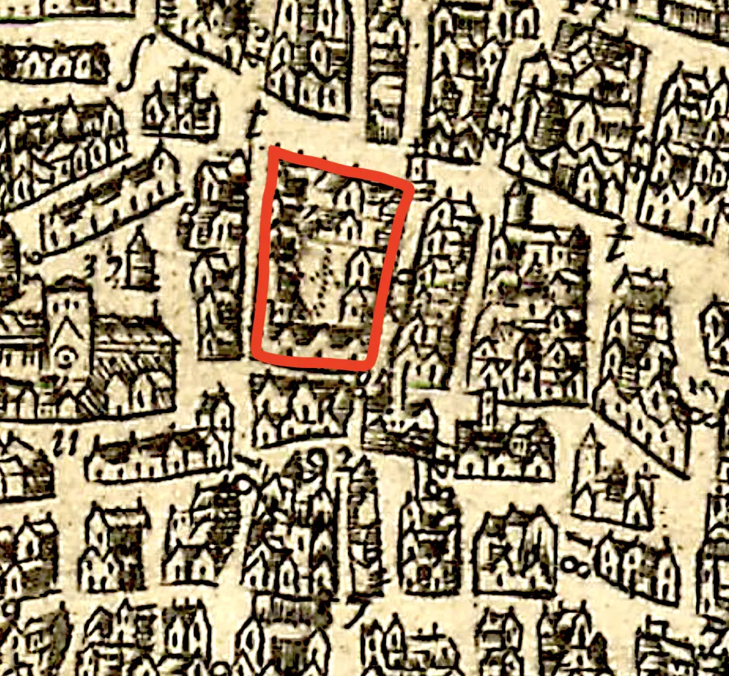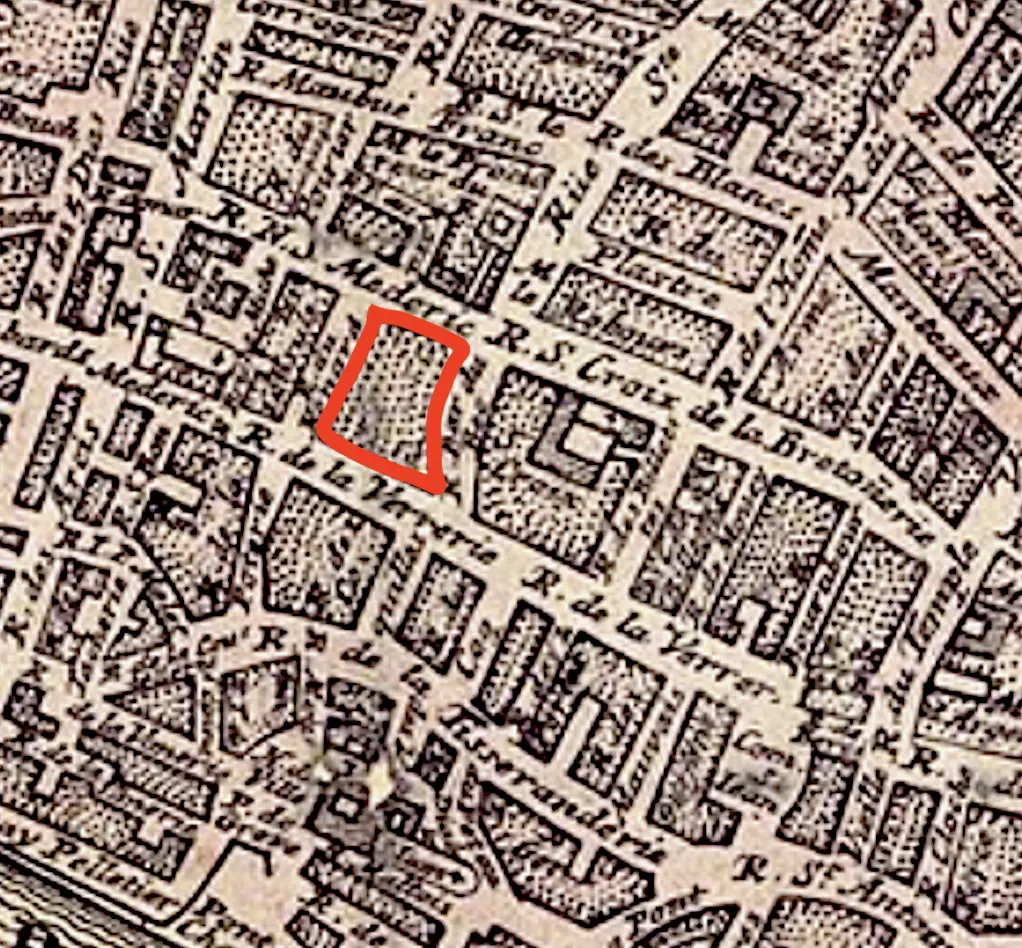 Historical maps of cities usually did not represent individual smaller buildings separately on the map. They would represent prominent buildings with their footprints, usually in a dark ink, then represent smaller buildings as a more lightly shaded block. These blocks did have discrete buildings, but there is no way to know their exact nature from the map. An individual building in such a block on a 1720 map might be the same building in such a block from a 1680 map, but it might not. Without specific records, there is no way to be sure.