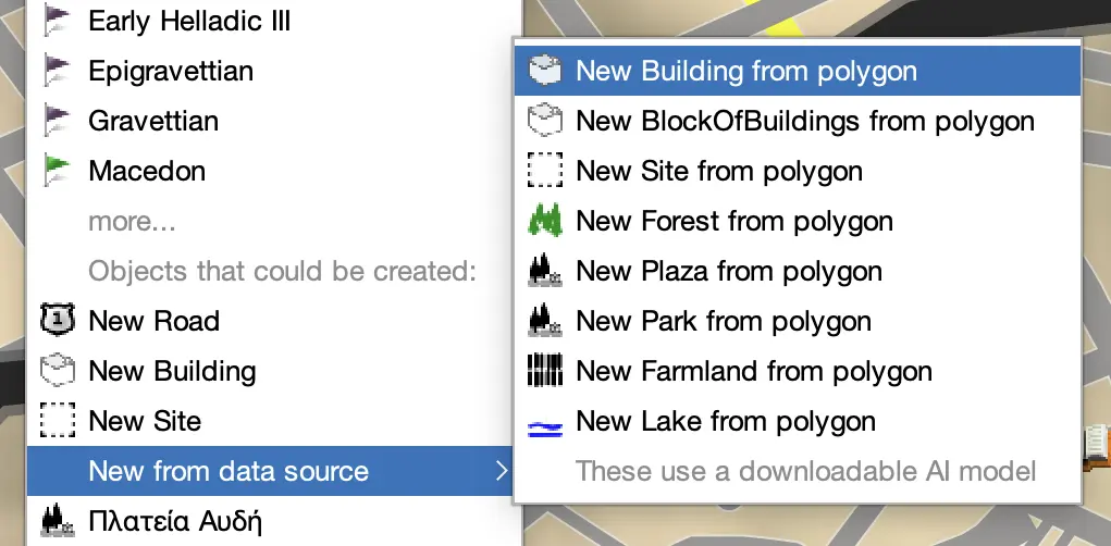 NOTEImports from OpenStreetMap usually come with both a location and a footprint already. The location and structure will have factoid dates of the current day, regardless of the date of your map during editing. These imports use the OSM Overpass server, which can sometimes be overloaded and give you a network error.