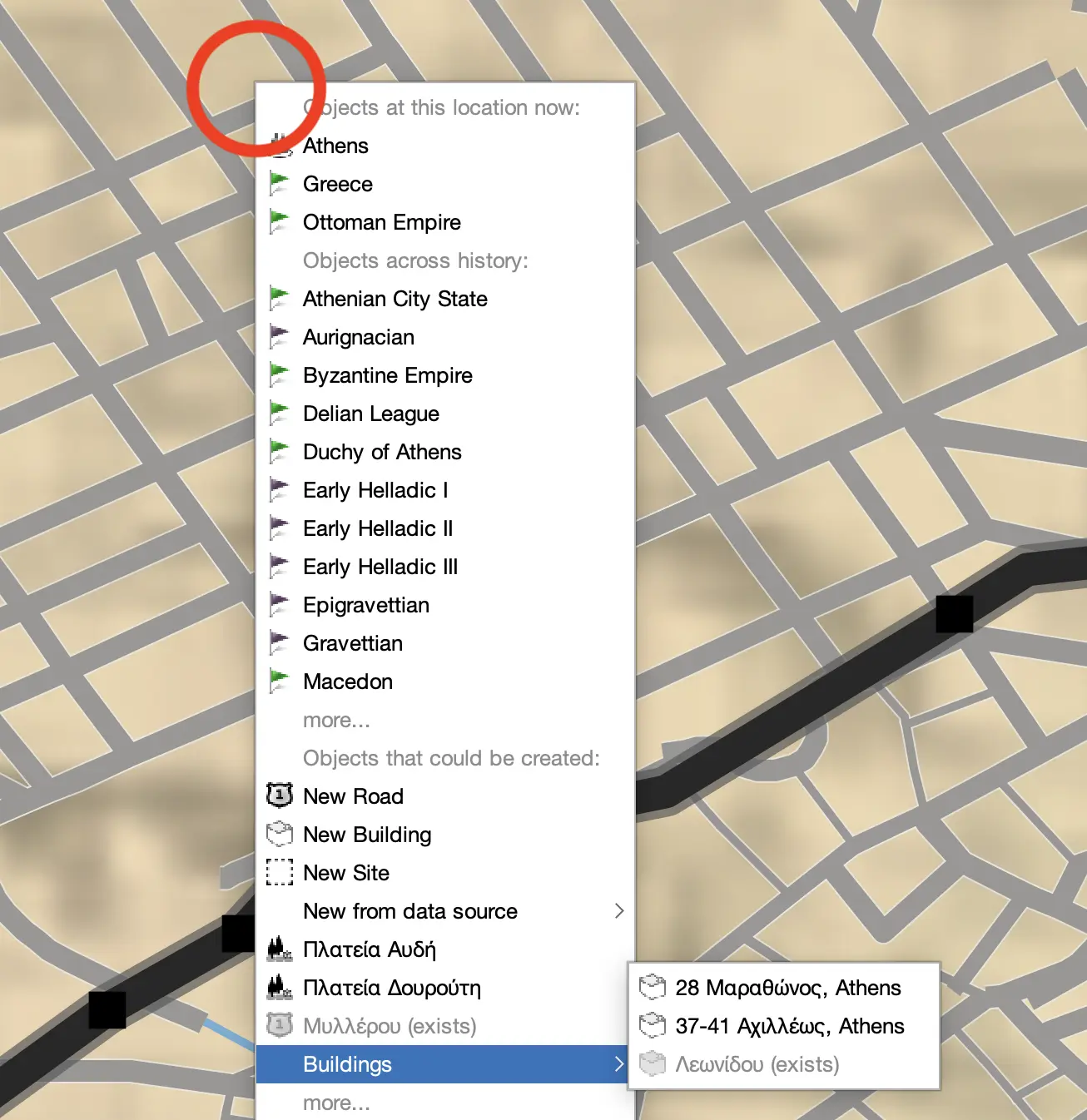 Adding a building usually starts from a location. Sometimes you have only the location and no name, structure, or date data. If you right click on the map, you can directly add a building at the spot using the pop-up menu. This will let you create a generic building at that location or you can import a candidate from a data source like OpenStreetMap.