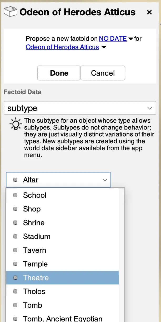 NOTE Types and subtypes are not temporal data. We strongly encourage using other temporal factoid data. However, buildings are sometimes most easily categorized by their subtype and this subtype information can be very useful to the history engine when making inferences. Buildings that have only had one use through their history are good candidates for a subtype, such as a temple, theater, or house.
